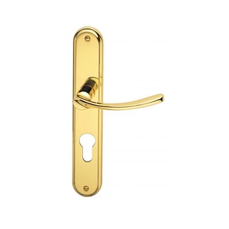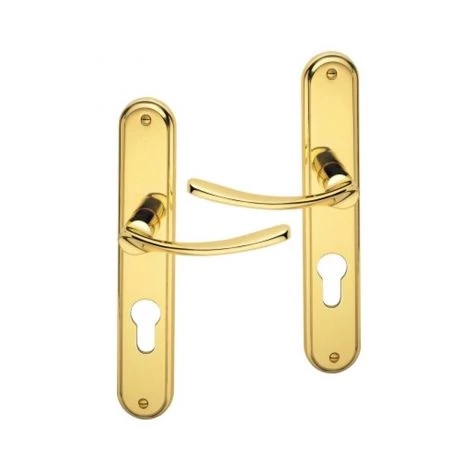 Garniture complète sur plaque – ensemble de 2 poignées de porte extérieure – en laiton finition poli, fonction Clé I pour cylindre de serrure de porte d’entrée ou de bureau.