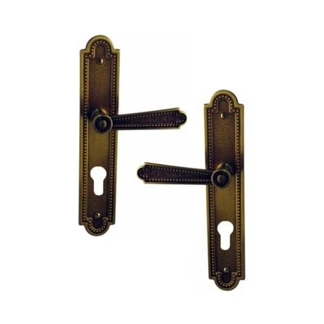 Garniture de porte complète ou ensemble de 2 poignées de porte extérieures modèle CHENONCEAUX en laiton finition patiné sur plaque fonction Clé I pour cylindre de serrure.