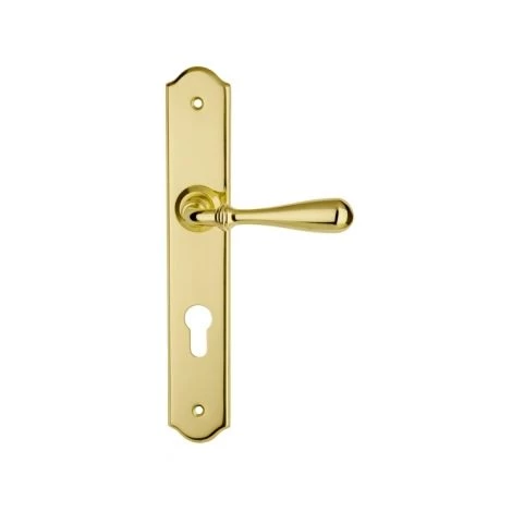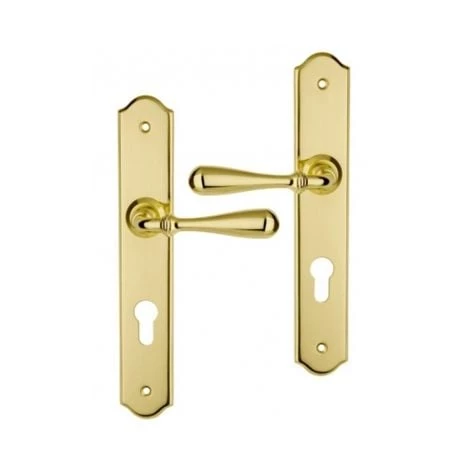 Garniture complète sur plaque – ensemble de 2 poignées de porte extérieures – en laiton finition poli, fonction Clé I pour cylindre de serrure de porte d’entrée ou de bureau.
