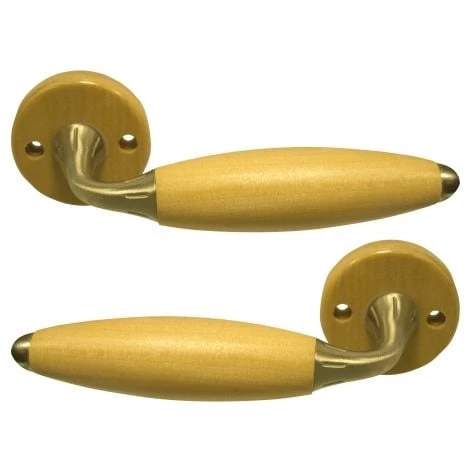 Garniture sur rosace ronde – ensemble de 2 poignées de porte – en bois finition vernis, fonction Bec de Cane vendue sans rosace de fonction.
