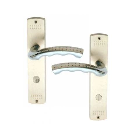 Garniture complète sur plaque – ensemble de 2 poignées de porte intérieure – en laiton finition nickel mat, avec 1 bouton de Condamnation côté intérieur et 1 bouton de Décondamnation côté extérieur pour salle de bains ou WC toilettes.