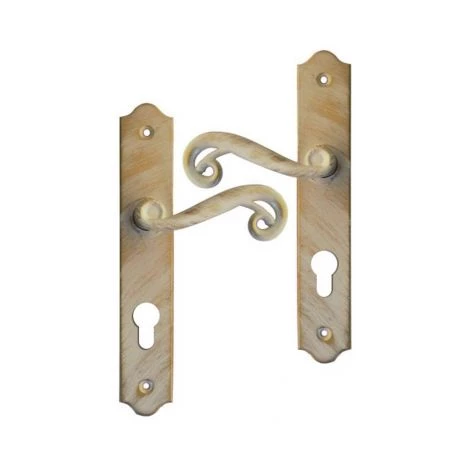 Garniture sur plaque – ensemble de 2 poignées de porte extérieure – en style fer forgé laqué blanc patiné doré, fonction Clé I pour cylindre de serrure de porte d’entrée ou de bureau.