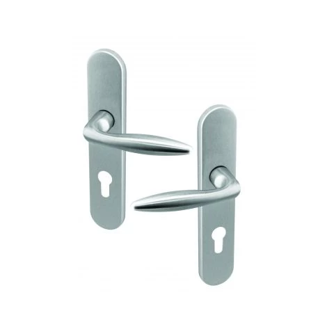 Garniture complète sur plaque – ensemble de 2 poignées de porte intérieure modèle ARENA et plaque ronde à jupe modèle Plano.