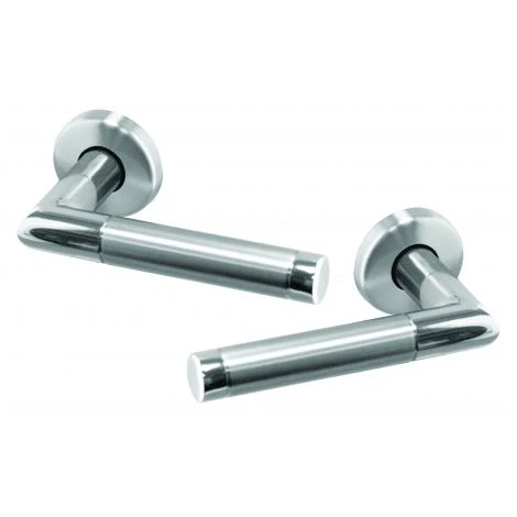 Garniture complète sur rosace – ensemble de 2 poignées de porte intérieure modèle TINA et rosace ronde à jupe modèle Plano.